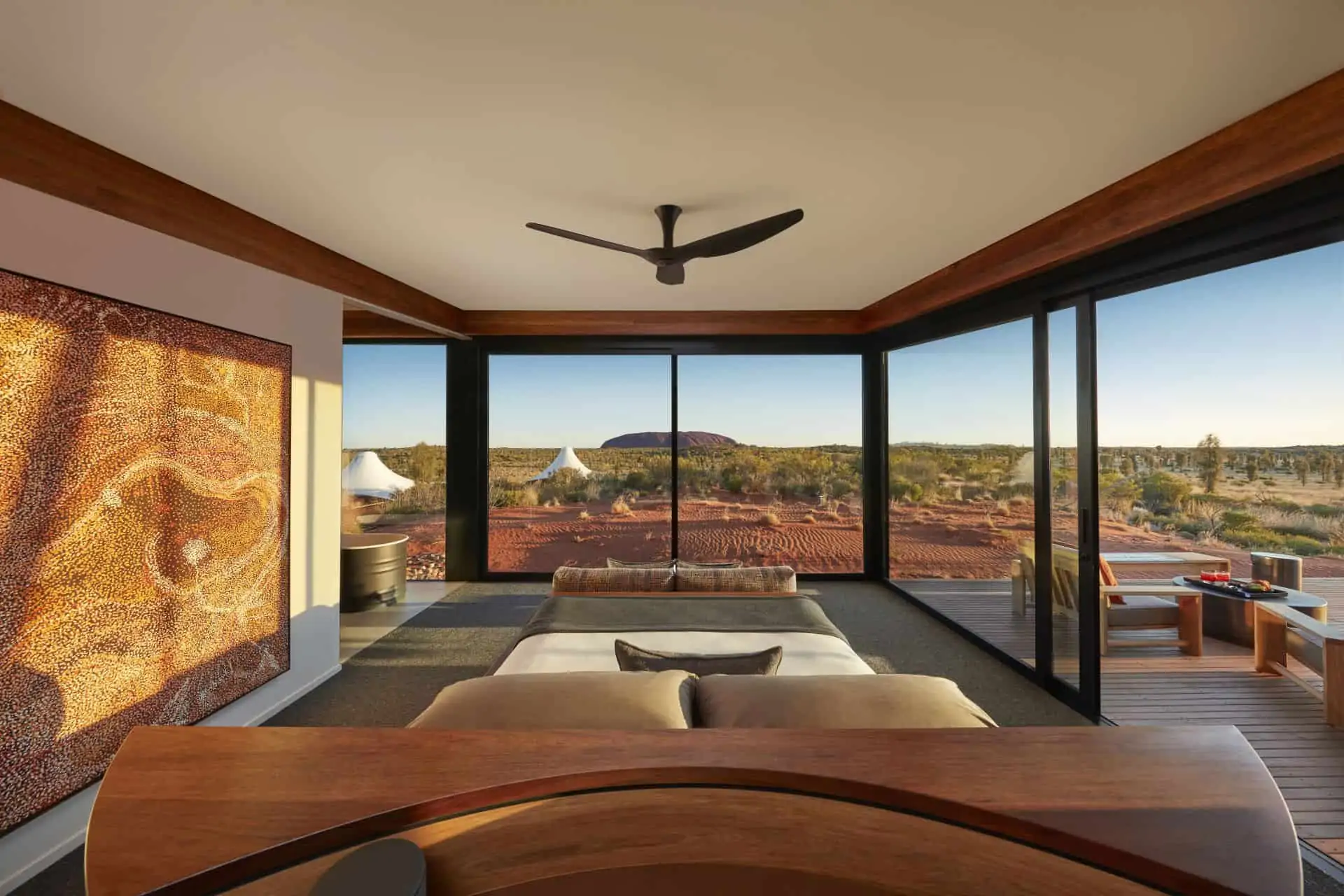 The camp’s sixteen tented pavilions stand lightly on the dunes, designed to frame uninterrupted views of the sacred monolith. Each one blends the raw textures of the desert with understated luxury: timber floors, billowing canopies, curated Aboriginal art, and a sense of solitude that feels almost spiritual. Guests wake to the glow of the rising sun through floor-to-ceiling windows and spend evenings on private decks watching the light fade into a field of stars. Within the Uluru–Kata Tjuta National Park, Longitude 131° offers privileged access to sites usually off-limits, allowing travelers to experience the land through guided walks that reveal the traditions, language, and cosmology of the Anangu people.